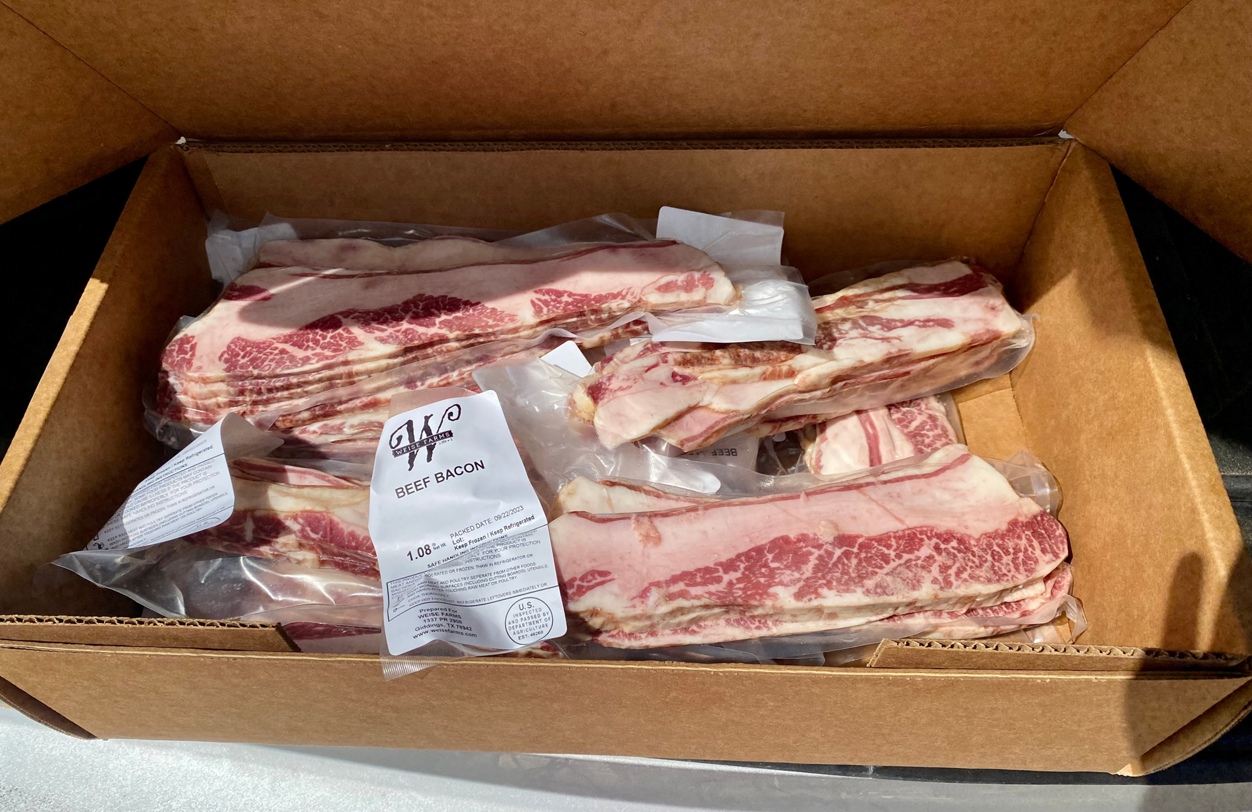 Weise Farms wagyu beef bacon is thick sliced and comes in one pound packages. It fries up a little different than pork bacon. I has a texture that is more like ham. It comes from the same place as pork belly, the navel. This is just another way to use up more of the whole animal.